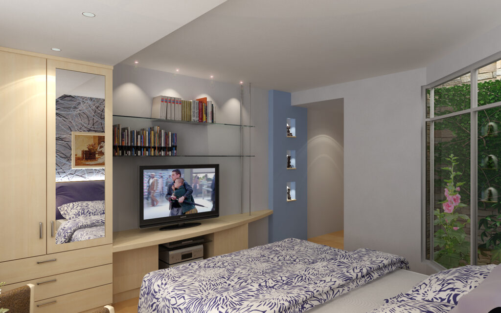 • Nội thất Thông minh: Tủ quần áo lớn, kệ TV và kệ sách bằng kính hoặc gỗ sáng màu, tối ưu hóa không gian lưu trữ và giải trí.